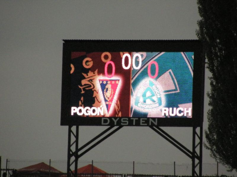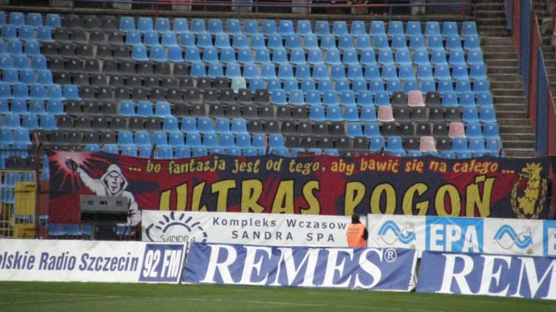 Wszystko po to, by zachęcić zgromadzonych kibiców Pogoni do przyjścia na galę sportów walki odbywającą się w Szczecinie. Im bliżej końca meczu, tym emocji było coraz więcej. Nie obyło się również bez obustronnej wymiany "uprzejmości" pomiędzy kibicami. Spotkanie zakończyło się bezbramkowym remisem dającym Pogoni awans do finału Pucharu Polski. "Portowcy" w szale radości wybiegli na murawę, by cieszyć się wraz z piłkarzami. Z kibicami nie cieszył się sędzia, który lekko poturbowany musiał się ewakuować. Kibice Ruchu, widząc, że miejscowi zbliżyli się nieco pod sektor gości, wskoczyli na płot i chwilę później zostali wyprowadzeni ze stadionu. Eskorty, jaką w drodze na dworzec mieli fani "Niebieskich", nie powstydziłyby się najważniejsze osoby w państwie. Chorzowianie ze Szczecina w drogę powrotna wyruszyli około 20:20. Po spokojnej podróży kilkanaście minut przed godz. 5 zameldowali się na Górnym Śląsku.