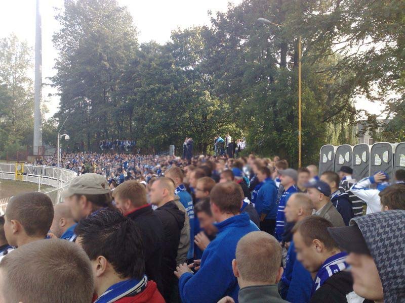 Było to spowodowane trwającym nadal protestem przeciwko działaniom piłkarskiej centrali. Druga część spotkania przebiegała już normalnie. Fani Niebieskich ruszyli z bardzo dobrym dopingiem oraz wywiesili na płocie flagi: "Psycho Fans", "Siemianowice", "Świętochłowice", "Mysłowice", "Radlin", "Blues Pszów" i "Kęty". Doping i zabawa na sektorze gości niosła się w okolicach stadionu i zagłuszała doping Odry, który tego dnia i tak był bardzo średni. Kibice Ruchu nie zaprezentowali podczas meczu żadnej oprawy, a swój debiut miała nowa piosenka, która na pewno zakorzeni się wśród chorzowskich kibiców: "Niebiescy hej, Niebiescy ole ole, nasza miłość jedyna, to Niebieska drużyna". Miejscowi w drugiej połowie prowadzili średni doping, słyszany na naszym sektorze tylko w chwilach krótkiego przestoju. Wywiesili 5 flag: "Fanatycy znad granicy", "Radlin", "Włókniarz Kietrz", "Ultras" oraz reprezentacyjną "Wodzisław Śląski". Odra zaprezentowała także oprawę składającą się z trzech sektorówek przedstawiających flagę Polski, Górnego Śląska oraz herby Polski i Górnego Śląska. Całość uzupełniał transparent "Polski Naród, Śląski Styl". Oprawę Odry kibice Ruchu skwitowali głośnym "Górny Śląsk" oraz "Polska bez Śląska". Mecz zakończył się wynikiem 1:3, co przerwało "klątwę" Wodzisławia, w którym Niebiescy do tej pory nigdy nie potrafili zdobyć kompletu punków. Po meczu piłkarze podeszli podziękować kibicom za wsparcie i bawili się, tworząc "Niebieska ciuchcię", która najprawdopodobniej stanie się nieodzownym elementem piłkarzy Ruchu po wygranym meczu. Za pośrednictwem naszego serwisu piłkarze oraz w głównej mierze trener Waldemar Fornalik pragną bardzo serdecznie podziękować kibicom Ruchu Chorzów za doping i ogromne wsparcie, na które w czasie meczu mogli liczyć zawodnicy oraz za docenienie pracy trenerskiej Waldemara Fornalika.