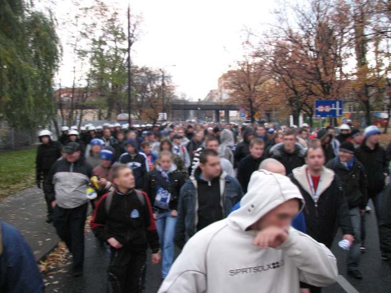 Jak się później okazało, na sektorze zasiadło nas dokładnie 758. Było nas łącznie ponad 800, ale sporo osób nie przeszło kontroli alko, a osoby z zakazami zostały w pociągu. Ta "niezbyt okazała" liczba (oczywiście w porównaniu do poprzednich wyjazdów powyżej tysiąca) nie przeszkodziła nam dobrze dopingować, zwłaszcza w II połowie. Na szczególną uwagę na pewno zasługuje śpiewane nieprzerwanie przez blisko 15 minut "Naszym Klubem HKS..." Kibice Legii, ze względu na trwający tam protest, dopingowali swoją drużynę tylko w końcówkach obu odsłon (2 razy 10 minut). Bluzgi trwały jednak cały mecz. Najczęściej polegały one na zmianie słów znanych piosenek obu ekip kibicowskich. Nie zabrakło znanej przyśpiewki "Polska bez Śląska", którą można było usłyszeć z sektorów tak gości, jak i gospodarzy.