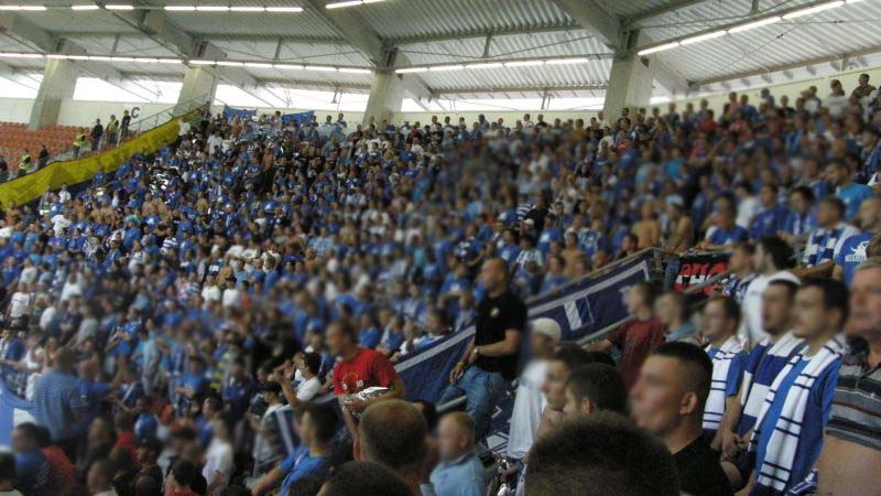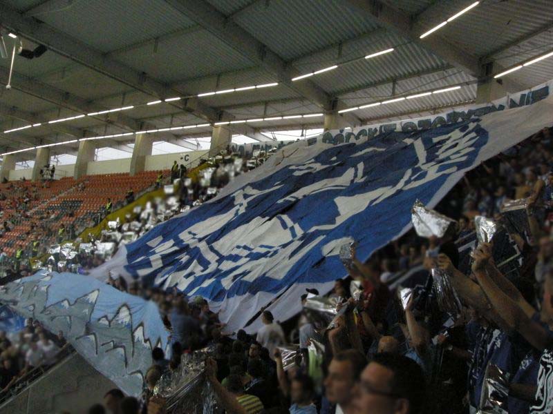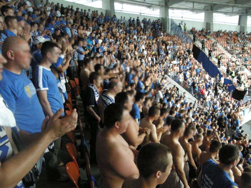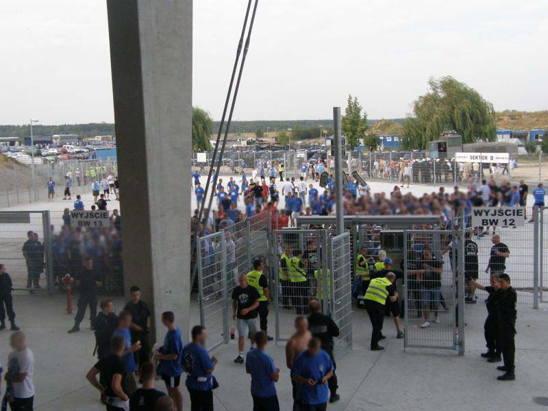 Nie obyło się bez problemów przy wchodzeniu na sektor. Tuż przed rozpoczęciem meczu doszło do małego spięcia z ochroną. W tym czasie gospodarze zaśpiewali "zostaw kibica...", "zawsze i wszędzie..." oraz "piłka nożna dla kibiców". Chorzowianie wchodzili do "klatki" przez całą pierwszą połowę, a ostatnie osoby dotarły na sektor dopiero po przerwie. Ostatecznie kibice Ruchu szczelnie wypełnili sektor gości i od początku spotkania prowadzili rewelacyjny doping. Pomimo meczącej drogi i upału Niebiescy nie tylko dobrze się bawili (np. tworząc "ciuchcię", która przyjęła się po debiucie na ostatnim meczu z Piastem), ale również zdzierali gardła, czego efektem był głośny fanatyczny śpiew, niosący się nie tylko po całym stadionie Dialog Arena, ale pewnie i po jego okolicach. W drugiej połowie meczu grupa Ultras Niebiescy zaprezentowała oprawę.