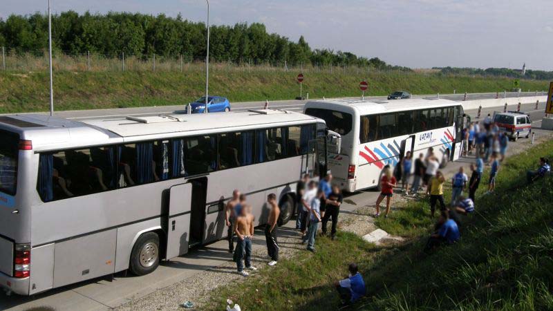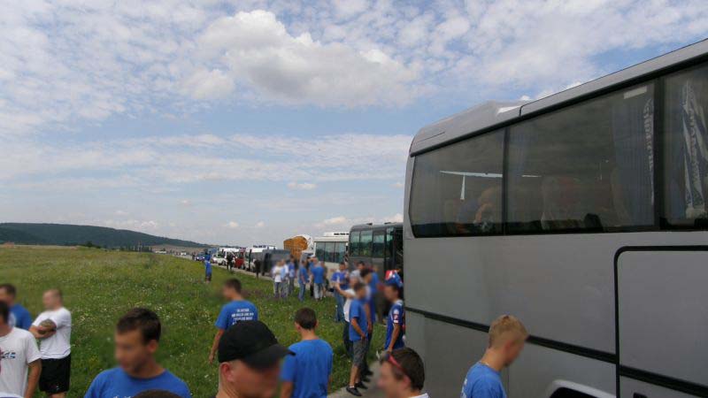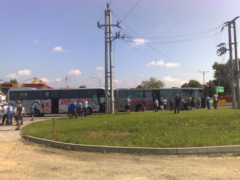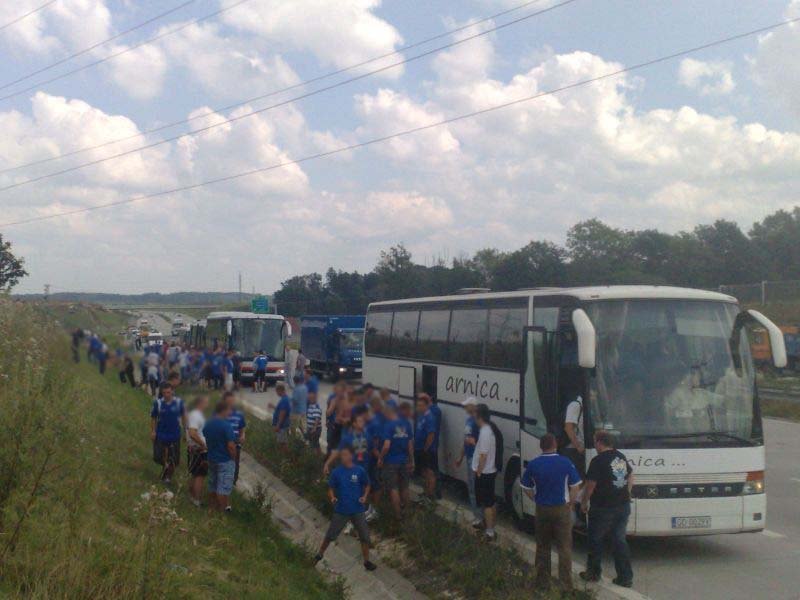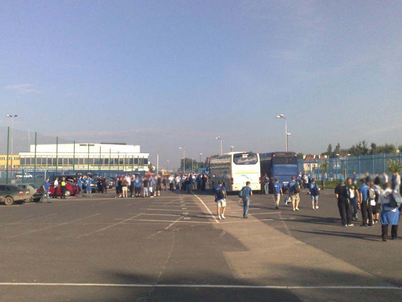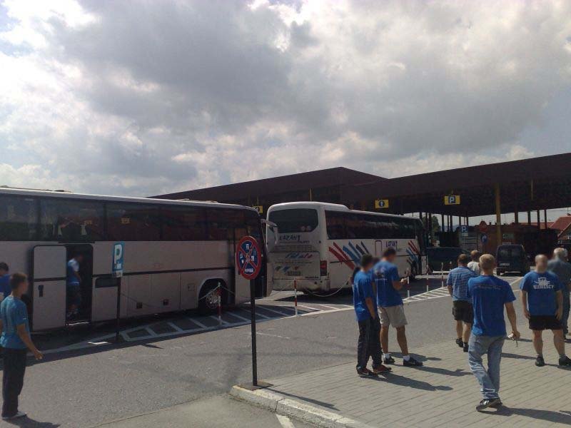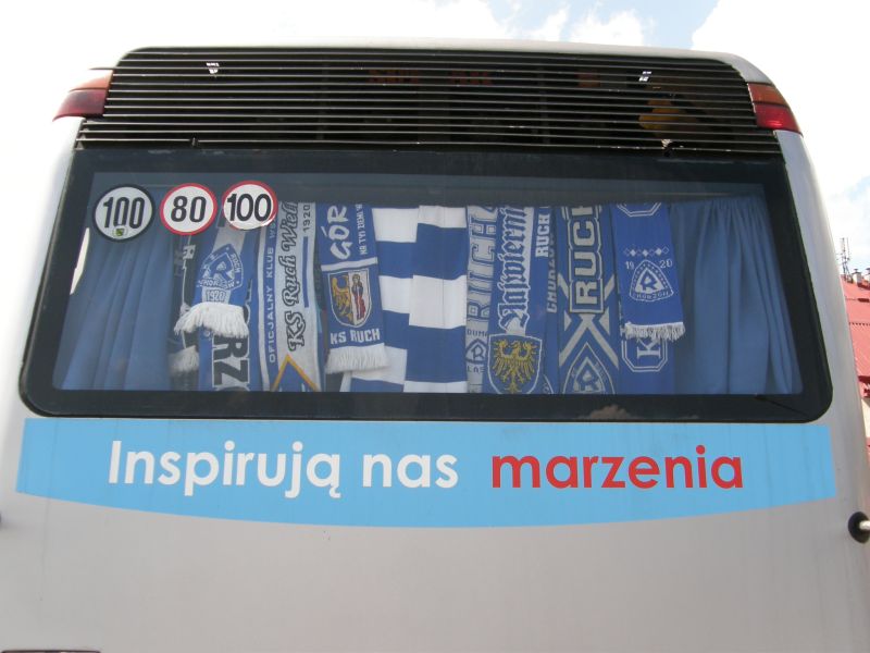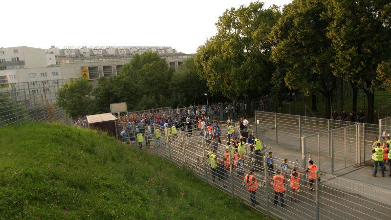 Po drodze jeden z autokarów uległ awarii w Żorach, jednak szybko został zorganizowany transport zastępczy, którym okazał się autobus miejski (najprawdopodobniej była to jego najdłuższa trasa). Ponadto wiele osób wyruszyło do Wiednia osobno. Pierwsi kibice pojawili się w Wiedniu już dzień przed meczem, by mieć chwilę na zwiedzanie i degustację austriackich trunków. Wraz z upływającym czasem w okolicach stadionu robiło się coraz bardziej niebiesko. Około 1,5 godziny przed meczem kibice Ruchu zaczęli wchodzić na stadion. Osoby, które zamiast biletu miały wystawione potwierdzenie wpłaty bez problemów były wpuszczane na sektor. Również osoby, której jechały w ciemno, miały możliwość zakupu biletu w kasach gospodarzy.