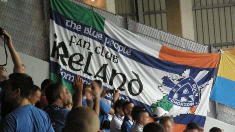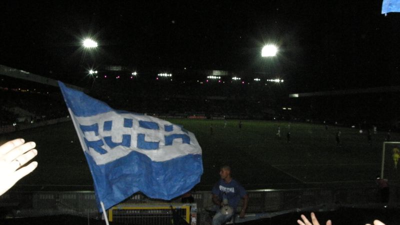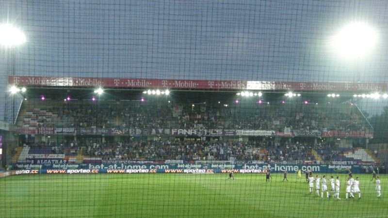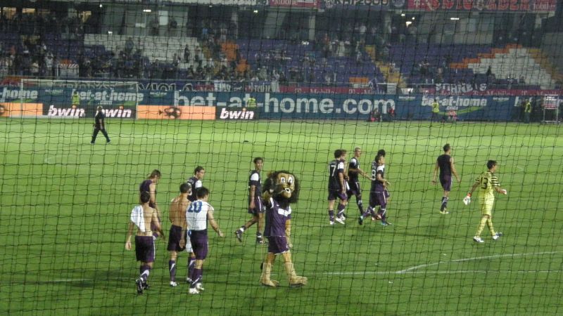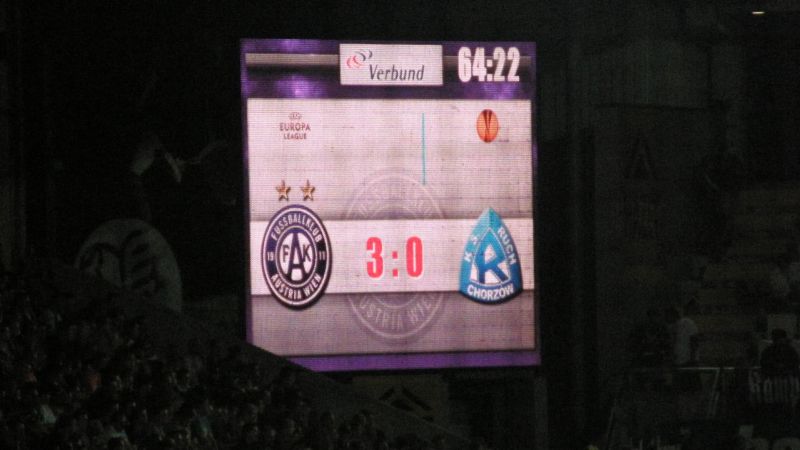 Oficjalnie na stadionie pojawiło się 1.500 fanów "Niebieskich"! Przed rozpoczęciem spotkania chorzowianie zaprezentowali próbkę dopingu, śpiewając podczas rozgrzewki piłkarzy głośne "Niebiescy ! Niebiescy ! Niebiescy !" oraz "Jesteśmy zawsze tam gdzie nasz Ruch Chorzów gra...", na co austriaccy fani zareagowali nieśmiałymi gwizdami. Jednak wraz z pierwszym gwizdkiem "Fioletowym" nie pozostawało nic innego, jak słuchać i starać się zagłuszyć rewelacyjny doping w wykonaniu Niebieskiej Szarańczy. Na boisku fatalnie rozpoczęło się dla Ruchu, bo gospodarze już w 3 minucie objęli prowadzenie po niesłusznie podyktowanym rzucie karnym. Dodatkowo chorzowianie musieli grać od tej pory w osłabieniu, bo Rafał Grodzicki zobaczył czerwoną kartkę. Kibice pożegnali schodzącego "Grodka" skandując jego nazwisko, natomiast w stronę sędziego rozniosło się głośne "wyp...".............