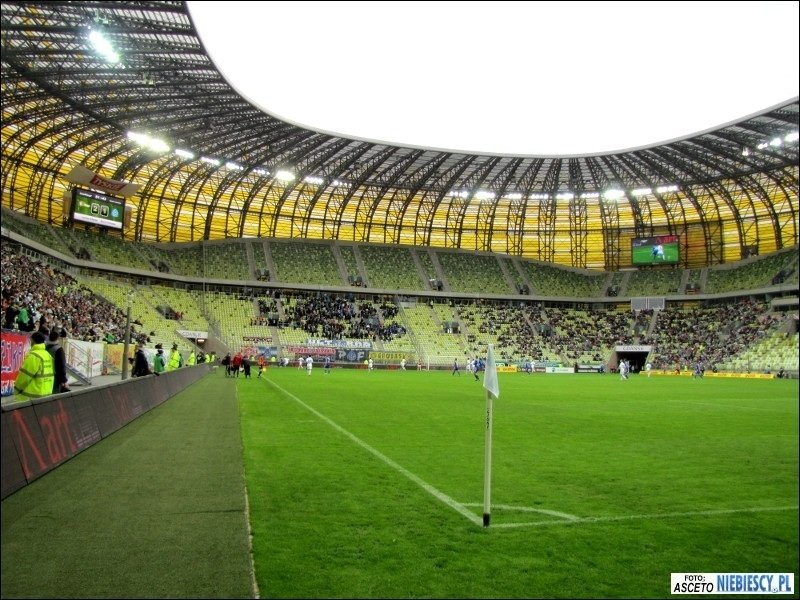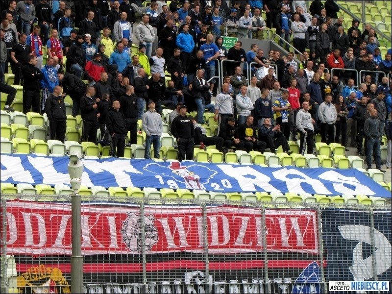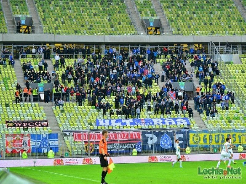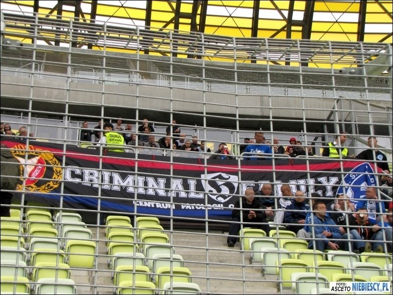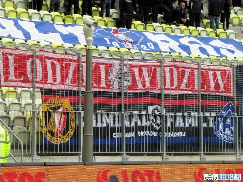 epozytu, który na nowym stadionie powinien być standardem. Również przeszukania były chwilami zabawne. Śledzący pies tropiący albo ściąganie w wybranych przypadkach tylko lewego buta do kontroli ;) W międzyczasie pod stadion dotarła grupa Elanowców, która dojechała autokarem i samochodami oraz 35 Widzewiaków z Grudziądza, którzy również wybrali transport kołowy. W Gdańsku pojawiliśmy się łącznie w 540 głów, z czego na sektorze gości zasiadło 525 osób. Razem z nami około 150 fanów Widzewa i 62 toruńskich fanatyków. Kilku zakazowiczów zostało pod stadionem, a kilku już na dworcu odłączyło się i wyruszyło na zwiedzanie Trójmiasta. Sektor gości przyozdobiło 9 flag. Cztery Ruchu: "P/R\F", "19/R\20", "ULTRAS", "To My Naród Śląski"; trzy Widzewa: "Łódzki Widzew", "WFCG" i debiutująca "FC Tomaszów Mazowiecki", która miała zawisnąć już ostatnio w Krakowie; jedna Elany: "Grubasy", a także łączona Ruchu i Widzewa "Criminal Family". Ochrona chciała ściągnąć wywieszoną "Konfederatkę", tłumacząc, że to symbol zakazany, ale nie potrafiła tego niczym umotywować.