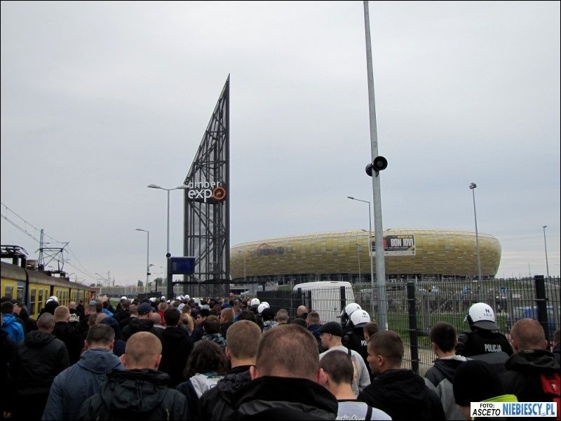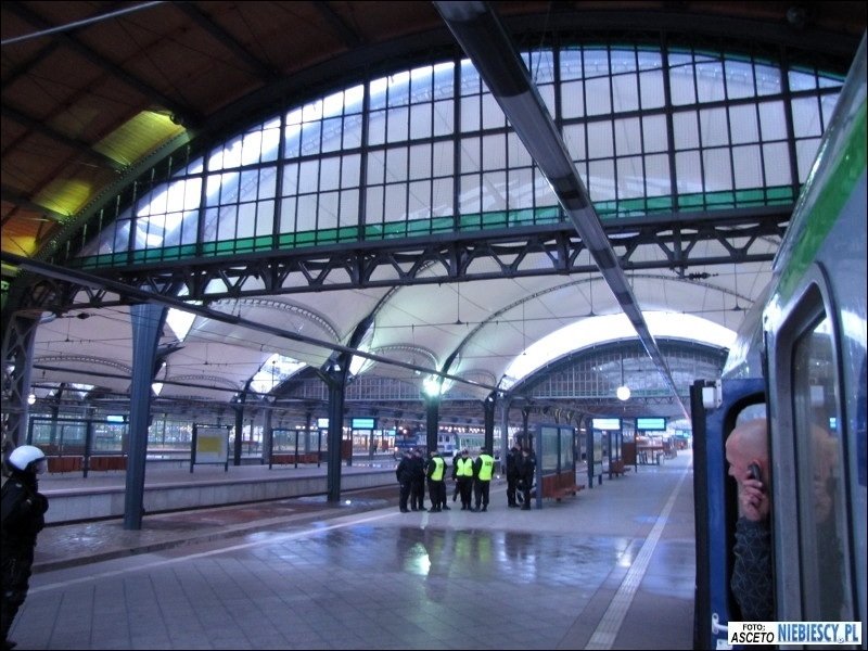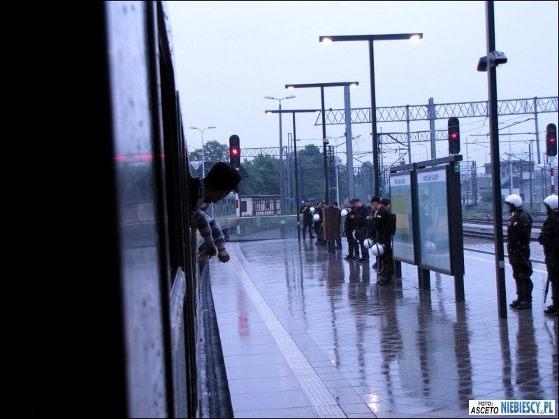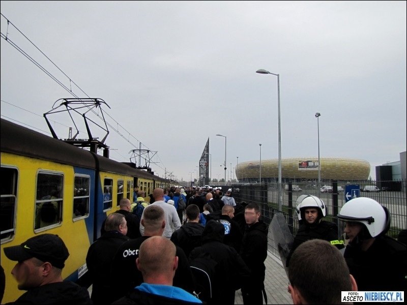 Po dotarciu na miejsce pozostało oczekiwać w pociągu 1,5 godziny na planowy odjazd bezpośredniego pociągu do Gdańska. Później ciekawie było podczas postoju w Poznaniu, gdzie pojawiły się głośne śpiewy i pirotechnika, a pomimo padającego deszczu i słownych docinek pewien chłopaczek, śmigający z torebką i dziewczyną za rękę, chciał pochwalić się koszulką Lech&Cracovia, jednak ta przy ściąganiu bluzy zaplątała mu się na brzuchu ;) Droga przebiegła spokojnie w dobrych nastrojach. W Bydgoszczy na dworcu głównym dosiadła się ponad 100-osobowa grupa Widzewiaków, która podobnie jak "Niebiescy" we Wrocławiu czekała 1,5 godziny na pociąg do Gdańska. Do stacji Gdańsk Główny dojechaliśmy planowo o godz. 15:11, skąd cała grupa została przewieziona podstawionym pociągiem podmiejskim pod stadion. O dziwo wchodzenie przebiegało dosyć sprawnie. Zabrakło jedynie d