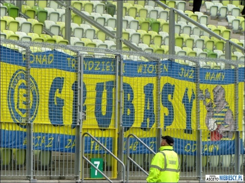 Flaga wisiała do końca spotkania... Doping można ocenić jako średni, ale momentami "Niebiescy" dawali całkiem dobre popisy wokalne, w szczególności po bramkach. Po drugim trafieniu część kontynuowała doping bez koszulek. W dopingu nie zabrakło pozdrowień dla naszych przyjaciół z Widzewa oraz Elany. Również Lechii nie szczędzono uprzejmości. Niestety, piłkarze pokazali jak w przeciągu chwili można zaprzepaścić wszystko i prowadząc 4:2 do 90 minuty pozwolili rywalowi wyrównać. Udowodnili, że można przegrać wygrany mecz, zdobywając tylko jeden punkt. Za postawę w końcówce spotkania zawodnicy Ruchu musieli usłyszeć kilka gorzkich słów od kibiców, które przyszło im wysłuchać jedynie ze spuszczonymi głowami. Jedynie kilku (Łukasz Janoszka, Marcin Malinowski) odważyło się podejść bliżej, by rzucić koszulki meczowe. Po meczu ponad dwie godziny oczekiwania na stadionie, aby wyruszyć w kierunku dworca. Porównując z naszą ostatnią wizytą, tym razem zdecydowanie mniej czasu spędziliśmy na Baltic Arenie. Niestety, catering również podupadł i już normą na nowych stadionach staje się nijaka kiełbasa w bułce i hot dog, a na pocieszenie festynowe piwo za 10 złotych. Ze stadionu wcześniej wypuszczono zmotoryzowaną grupę Elanowców i fanów Widzewa z WFCG .