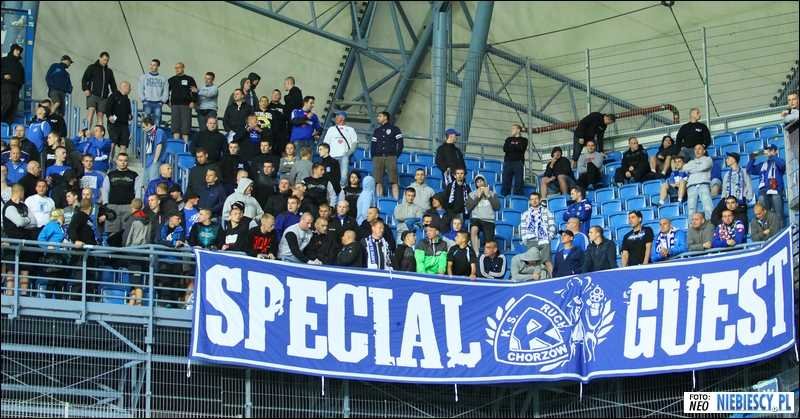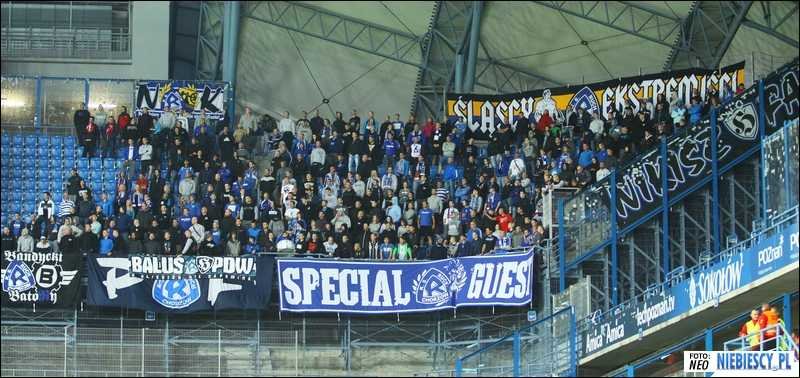 Płoty sektora gości przyozdobiły flagi: "P/R\F", "Special Guest", "Śląscy Ekstremiści", "RTS" (Widzewa), "Niebieskie Siemce - Ekipa Wyjazdowa", "Nikisz Fans", "N/R\K", "NRŚL Gang", "Świętochłowice", "Niebieskie Łaziska", "Bandycki Batory", "Kęty on tour" oraz transparent "Baluś PDW".