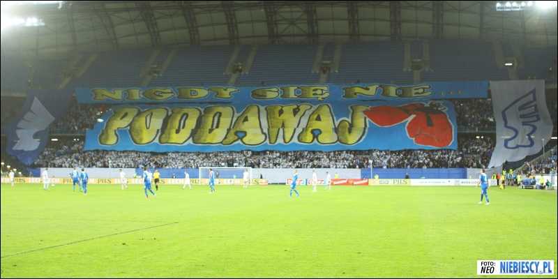 Gospodarze na początku drugiej połowy zaprezentowali oprawę z transparentem "Nigdy się nie...", który uzupełnia sektorówka "PODDAWAJ" z rękawicami bokserskimi. Całość uzupełniała kartoniada w barwach i fragmenty herbu po bokach. Cała oprawa prezentowana w skupieniu i ciszy. Po chwili obrócono sektorówkę i pojawiło się hasło "Nigdy się nie... PRZYZNAWAJ", a dodatkowo odpalono kilkanaście rac po bokach. Co do flag, to dopiero w 65. minucie fani Lecha zaczęli rozwieszać flagę "Kibolski Klub Sportowy" i była to ich jedyna flaga na meczu.