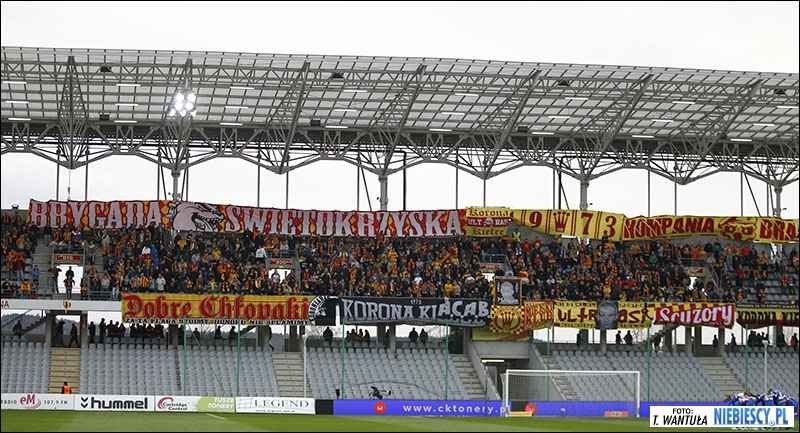 Fani Korony praktycznie jak zawsze zapełnili środkową część górnej trybuny młyna i dobrze oflagowali swoje sektory. Ciężko określić ich doping, bo stosunkowo rzadko przebijał się na sektorze gości. "Koroniarze" próbowali w pierwszej połowie jakichś podchodów pod sektorem gości. Pytanie jedynie czy tak nieudolnie próbowali przeprowadzić szarżę na flagi, chowając się za filarami licząc, że mają pelerynki niewidki i nikt ich nie widzi, czy po prostu chcieli zobaczyć "jak to się robi na południu". Tym niemniej śmiesznie to wyglądało z boku - "pójdę, nie pójdę, pójdę, nie pójdę" i nie poszli ;)