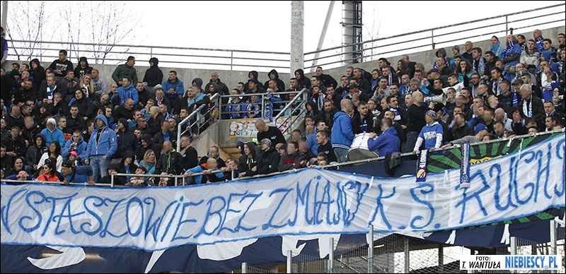 "Radlin", "Zawiercie", "Niebieskie Siemce - ekipa wyjazdowa", "N/R\K" (wyjazdówka Katowic), "Racibórz", "Niebieskie Łaziska", "Świętochłowice", "Kęty", "Śląsk Cieszyński" oraz dwie flagi Pogoni Staszów "19P45" i "Tylko Pogoń". Dodatkowo w drugiej połowie Niebiescy ze Staszowa wywiesili transparenty "Denis 3maj się" i "W Staszowie bez zmiany K.S. Ruch pany!".