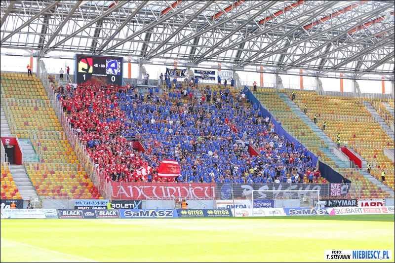 Sektor w większości zapełnił się w Niebiesko-Czerwonym kolorze i w 34 minucie na stadionie poniosło się głośne "Jesteśmy zawsze tam". Z każdą chwilą doping coraz głośniej się rozkręcał. Nawet stracona bramka nie była w stanie zatrzymać rozpędzonej dopingowej korby i było jeszcze głośniej. Oprócz chorzowskich przyśpiewek nie zabrakło pozdrowień dla Widzewa. W drugiej połowie pojawiło się niebiesko-czerwone flagowisko. Niestety z powodu zamieszania pod bramą nie została zaprezentowana przygotowana na mecz oprawa.