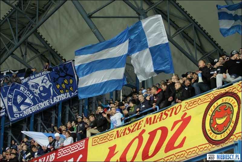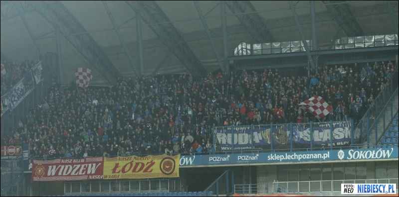 Pomimo wyjazdu z Chorzowa o godz. 8:40, Niebiescy pod stadion dotarli dopiero na godzinę przed meczem, jednak samo wchodzenie przebiegało dosyć sprawnie i większość przybyłych obecna była na sektorze przed pierwszym gwizdkiem. Klatkę przyozdobiło kilkanaście flag Niebieskich w tym m.in.: "Psycho Fans", "Widzew Łódź", "19/R\20", "Niebieskie Siemce", "N/R\K", "Ruda Śląska", "Niebieskie Łaziska", "Radlin", "Nakło Śląskie", "Mikołów", "Kęty", "Racibórz" oraz transparenty "Zając PDW", "Herman wracaj do zdrowia", "Api PDW” oraz transparent Widzewa "Śmierć konfidentom". Trzeba zaznaczyć, że w repertuarze fanów Ruchu oraz Lecha nie zabrakło licznych bluzgów.