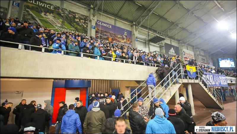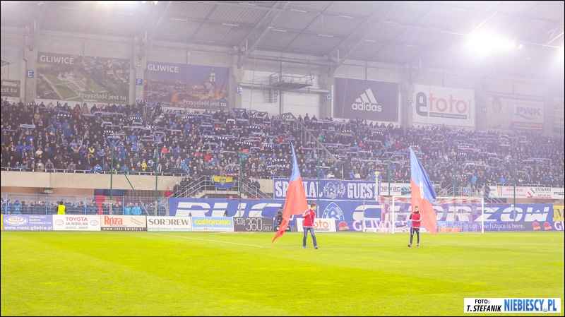Zbiórka kibiców zaplanowana została o godz. 17:30 na parkingu klubowym i po 18:00 większość osób wyruszyła w kierunku Gliwic. Oczywiście sporo osób dojeżdżało później, ale już mniej więcej dwie godziny przed meczem pierwsi kibice Ruchu zaczęli kręcić się w okolicach stadionu i z minuty na minutę Niebieskich przybywało. Na godzinę przed pierwszym gwizdkiem na stadionie było już kilkuset kibiców Ruchu i frekwencja cały czas wzrastała. Pomimo wykupionych biletów na łuk oraz część prostej, Niebiescy ostatecznie zajęli i zapełnili ponad stan całą trybunę za bramką wraz z narożnikami. Dodatkowo grupa chorzowian obecna była na prostej.