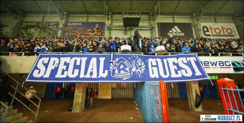 Oficjalna liczba "Niebieskiej Szarańczy" na meczu w Gliwicach to 3300 osób, chociaż można byłoby polemizować czy czasem nie było nas więcej. Ponad trzy tysiące osób na zakazie wyjazdowym robi wrażenie. Podczas meczu wsparła nas również grupa około 100 Widzewiaków oraz delegacja Elany Toruń, którym dziękujemy za wsparcie. Nie możemy również pominąć "Super MaRia" czyli Mariusza Śrutwy, który wraz z kibicami dopingował Niebieskich z trybun. Mamy nadzieję, że kolejne wyjazdy będą równie sumiennie zaliczane przez "MaRia" ;) Sektory zajęte przez fanów Ruchu przyozdobiły dwie flagi "Special Guest" oraz "Ruch Chorzów".