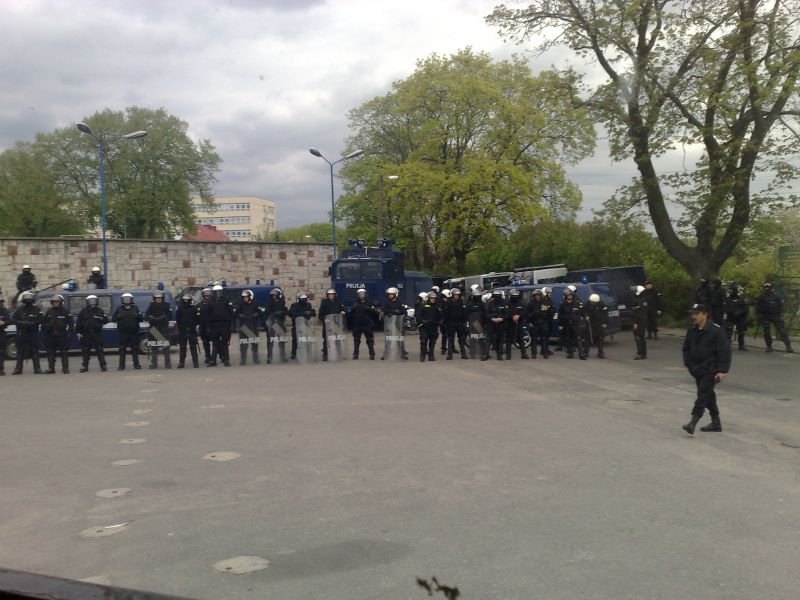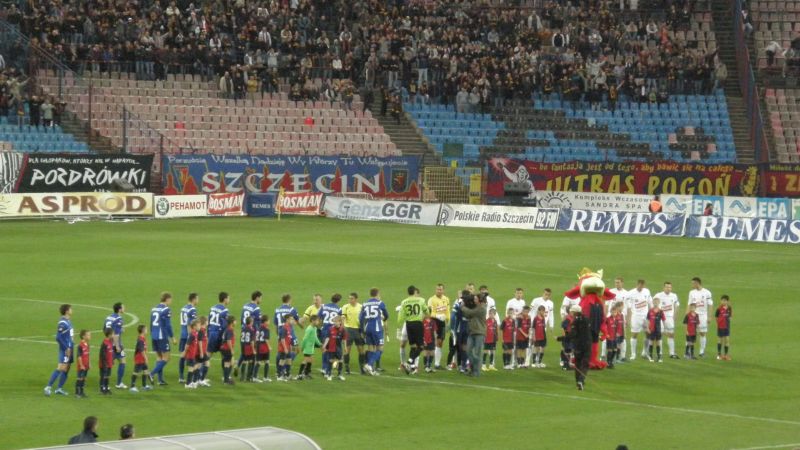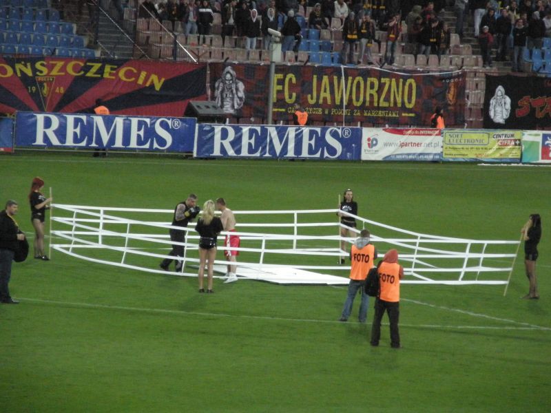 Wszystko po to, by zachęcić zgromadzonych kibiców Pogoni do przyjścia na galę sportów walki odbywającą się w Szczecinie. Im bliżej końca meczu, tym emocji było coraz więcej. Nie obyło się również bez obustronnej wymiany "uprzejmości" pomiędzy kibicami. Spotkanie zakończyło się bezbramkowym remisem dającym Pogoni awans do finału Pucharu Polski. "Portowcy" w szale radości wybiegli na murawę, by cieszyć się wraz z piłkarzami. Z kibicami nie cieszył się sędzia, który lekko poturbowany musiał się ewakuować. Kibice Ruchu, widząc, że miejscowi zbliżyli się nieco pod sektor gości, wskoczyli na płot i chwilę później zostali wyprowadzeni ze stadionu. Eskorty, jaką w drodze na dworzec mieli fani "Niebieskich", nie powstydziłyby się najważniejsze osoby w państwie. Chorzowianie ze Szczecina w drogę powrotna wyruszyli około 20:20. Po spokojnej podróży kilkanaście minut przed godz. 5 zameldowali się na Górnym Śląsku.
