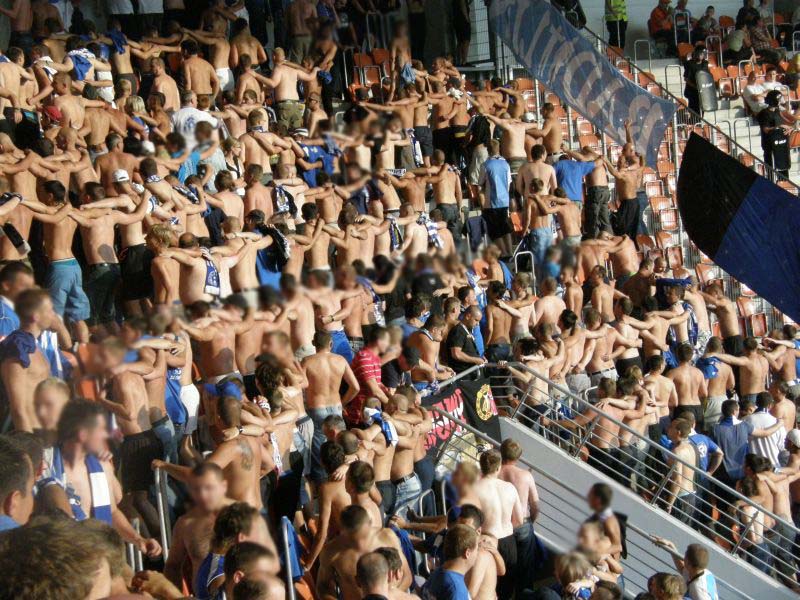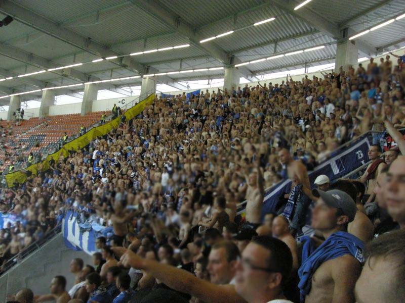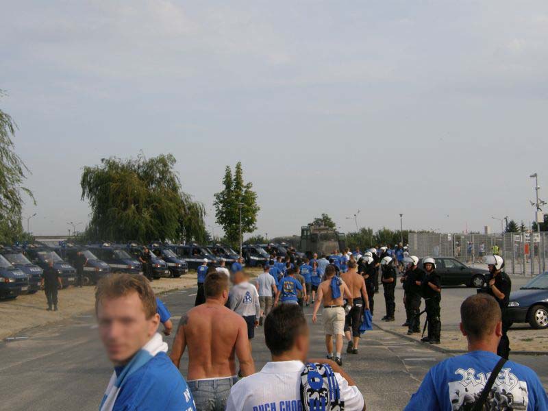 Nie obyło się bez problemów przy wchodzeniu na sektor. Tuż przed rozpoczęciem meczu doszło do małego spięcia z ochroną. W tym czasie gospodarze zaśpiewali "zostaw kibica...", "zawsze i wszędzie..." oraz "piłka nożna dla kibiców". Chorzowianie wchodzili do "klatki" przez całą pierwszą połowę, a ostatnie osoby dotarły na sektor dopiero po przerwie. Ostatecznie kibice Ruchu szczelnie wypełnili sektor gości i od początku spotkania prowadzili rewelacyjny doping. Pomimo meczącej drogi i upału Niebiescy nie tylko dobrze się bawili (np. tworząc "ciuchcię", która przyjęła się po debiucie na ostatnim meczu z Piastem), ale również zdzierali gardła, czego efektem był głośny fanatyczny śpiew, niosący się nie tylko po całym stadionie Dialog Arena, ale pewnie i po jego okolicach. W drugiej połowie meczu grupa Ultras Niebiescy zaprezentowała oprawę.