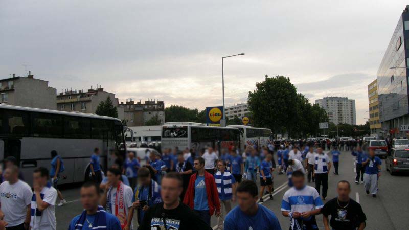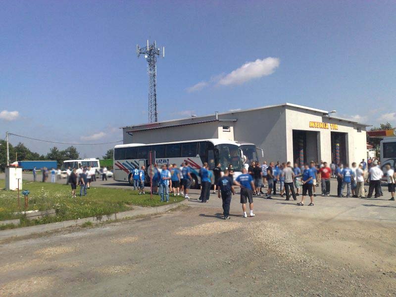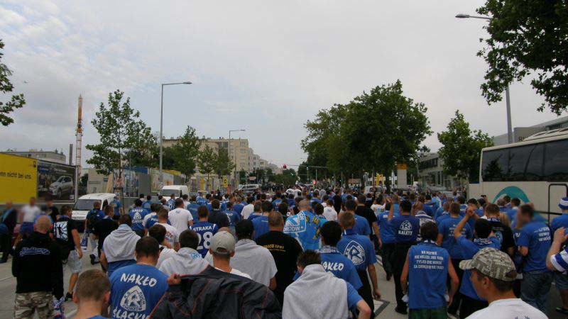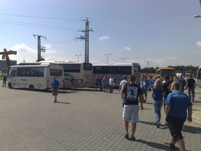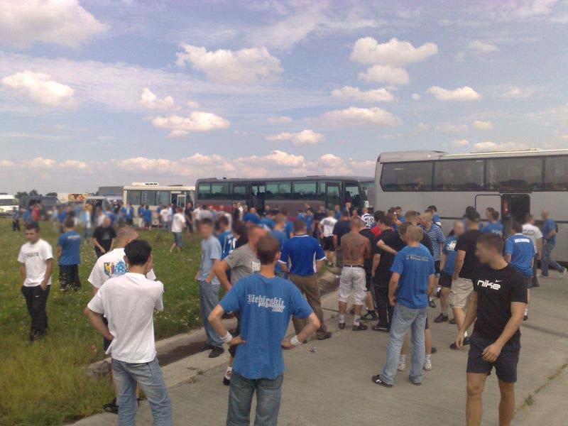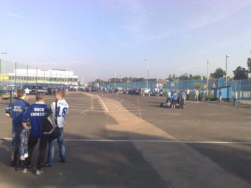 Po drodze jeden z autokarów uległ awarii w Żorach, jednak szybko został zorganizowany transport zastępczy, którym okazał się autobus miejski (najprawdopodobniej była to jego najdłuższa trasa). Ponadto wiele osób wyruszyło do Wiednia osobno. Pierwsi kibice pojawili się w Wiedniu już dzień przed meczem, by mieć chwilę na zwiedzanie i degustację austriackich trunków. Wraz z upływającym czasem w okolicach stadionu robiło się coraz bardziej niebiesko. Około 1,5 godziny przed meczem kibice Ruchu zaczęli wchodzić na stadion. Osoby, które zamiast biletu miały wystawione potwierdzenie wpłaty bez problemów były wpuszczane na sektor. Również osoby, której jechały w ciemno, miały możliwość zakupu biletu w kasach gospodarzy.