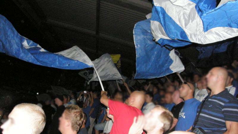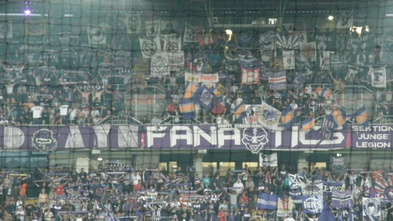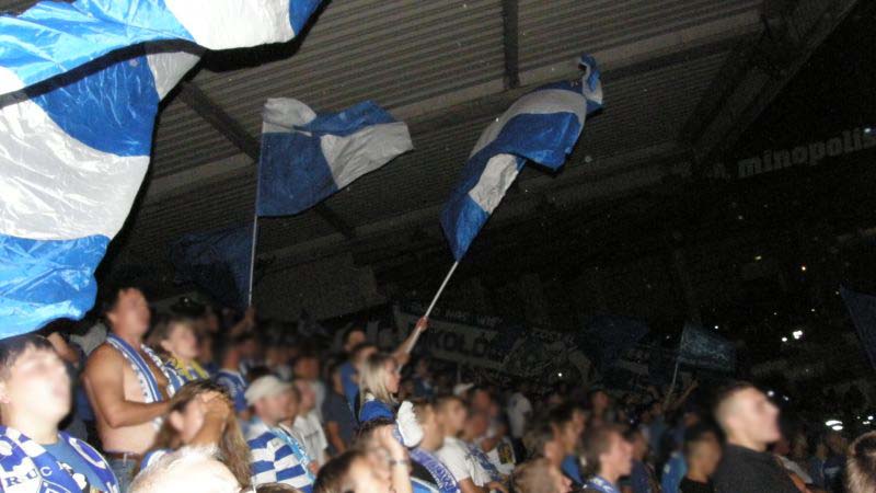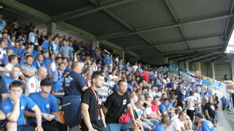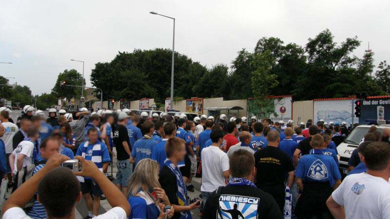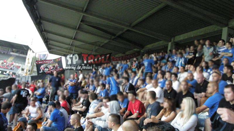 Oficjalnie na stadionie pojawiło się 1.500 fanów "Niebieskich"! Przed rozpoczęciem spotkania chorzowianie zaprezentowali próbkę dopingu, śpiewając podczas rozgrzewki piłkarzy głośne "Niebiescy ! Niebiescy ! Niebiescy !" oraz "Jesteśmy zawsze tam gdzie nasz Ruch Chorzów gra...", na co austriaccy fani zareagowali nieśmiałymi gwizdami. Jednak wraz z pierwszym gwizdkiem "Fioletowym" nie pozostawało nic innego, jak słuchać i starać się zagłuszyć rewelacyjny doping w wykonaniu Niebieskiej Szarańczy. Na boisku fatalnie rozpoczęło się dla Ruchu, bo gospodarze już w 3 minucie objęli prowadzenie po niesłusznie podyktowanym rzucie karnym. Dodatkowo chorzowianie musieli grać od tej pory w osłabieniu, bo Rafał Grodzicki zobaczył czerwoną kartkę. Kibice pożegnali schodzącego "Grodka" skandując jego nazwisko, natomiast w stronę sędziego rozniosło się głośne "wyp...".............