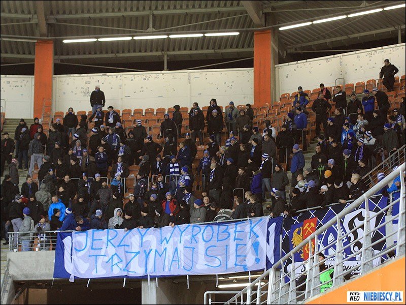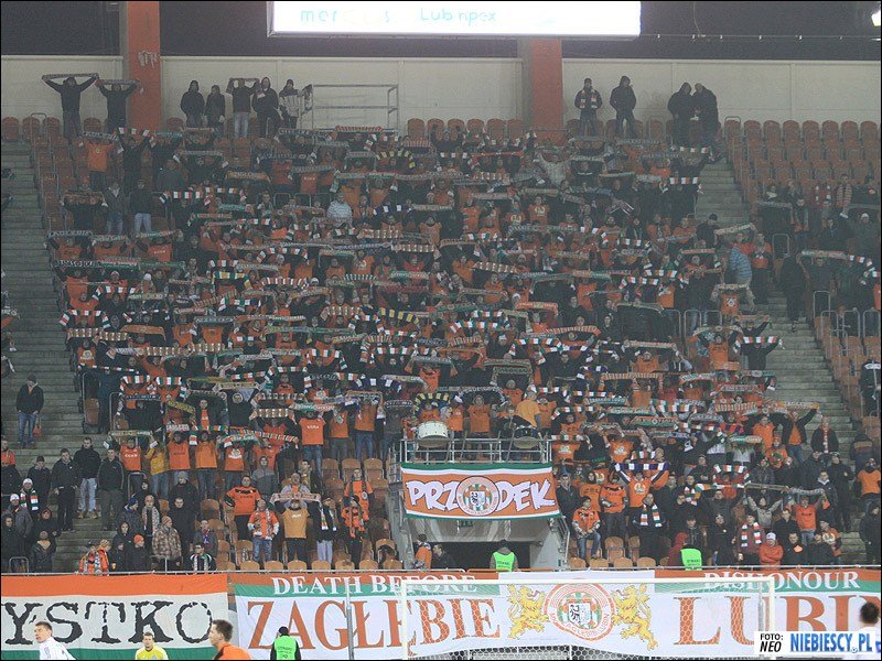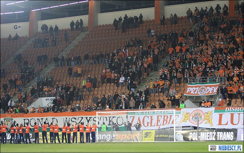 Ostatecznie w sektorze gości zameldowały się 282 osoby (w tym 13 osób z dolnośląskiego Fan Clubu Dzierżoniów), a 6 pozostało w autokarze lub pod stadionem. Sektor gości przyozdobiło 8 flag: "RUCH CHORZÓW", "19/R\20", "Świętochłowice", "Radlin", "Myszków Baku Boys", "Zawiercie", "Lędziny & Bieruń", "Śląsk Cieszyński" oraz transparent wywieszony w drugiej połowie "JERZY WYROBEK TRZYMAJ SIĘ!". Frekwencja na tym wyjeździe nie powalała na kolana, lecz doping można określić jako dobry, a po strzelonych bramkach wręcz bardzo dobry! W repertuarze nie zabrakło wymiany uprzejmości rozpoczętej przez "Niebieskich", dającej jednoznacznie do zrozumienia, co chorzowianie myślą o kibicach Zagłębia. Mecz zakończył się remisem 2:2 i nasz dalszy udział rozstrzygnie się w rewanżu na Cichej.