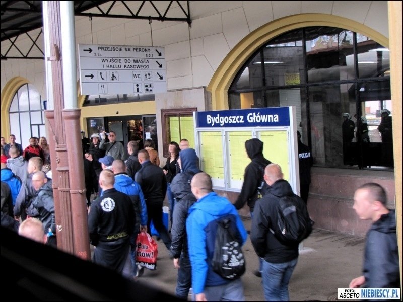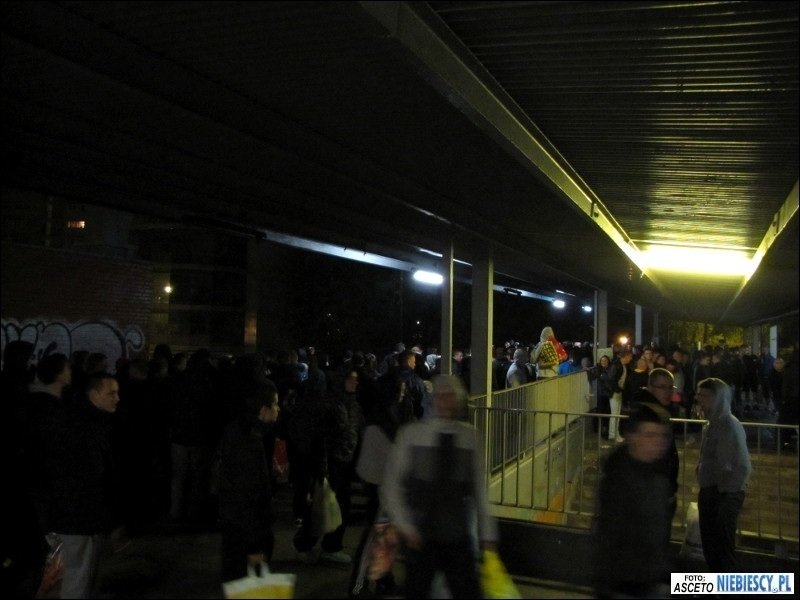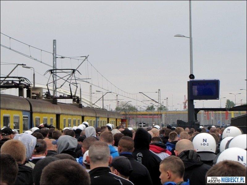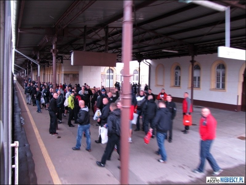 Po dotarciu na miejsce pozostało oczekiwać w pociągu 1,5 godziny na planowy odjazd bezpośredniego pociągu do Gdańska. Później ciekawie było podczas postoju w Poznaniu, gdzie pojawiły się głośne śpiewy i pirotechnika, a pomimo padającego deszczu i słownych docinek pewien chłopaczek, śmigający z torebką i dziewczyną za rękę, chciał pochwalić się koszulką Lech&Cracovia, jednak ta przy ściąganiu bluzy zaplątała mu się na brzuchu ;) Droga przebiegła spokojnie w dobrych nastrojach. W Bydgoszczy na dworcu głównym dosiadła się ponad 100-osobowa grupa Widzewiaków, która podobnie jak "Niebiescy" we Wrocławiu czekała 1,5 godziny na pociąg do Gdańska. Do stacji Gdańsk Główny dojechaliśmy planowo o godz. 15:11, skąd cała grupa została przewieziona podstawionym pociągiem podmiejskim pod stadion. O dziwo wchodzenie przebiegało dosyć sprawnie. Zabrakło jedynie d