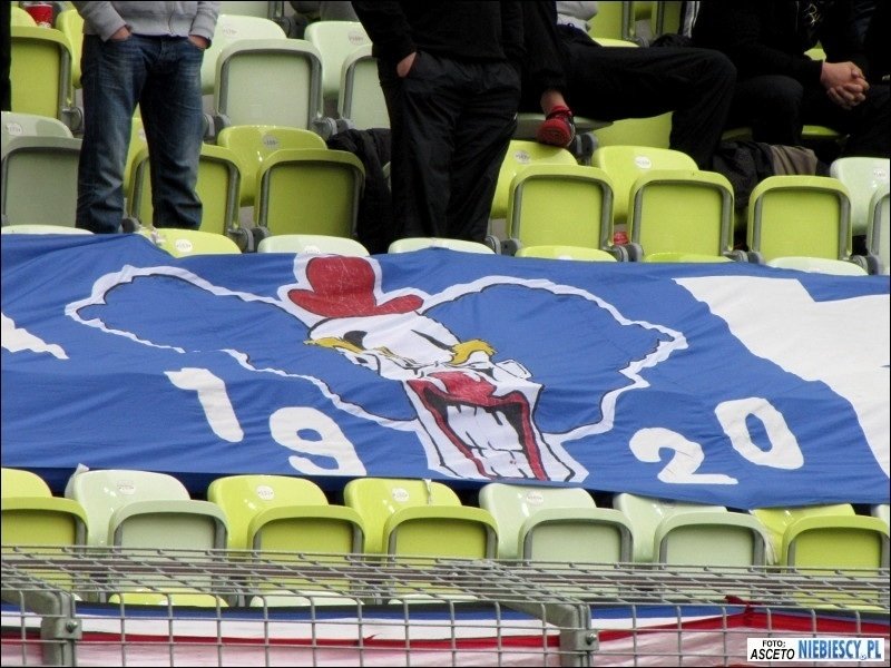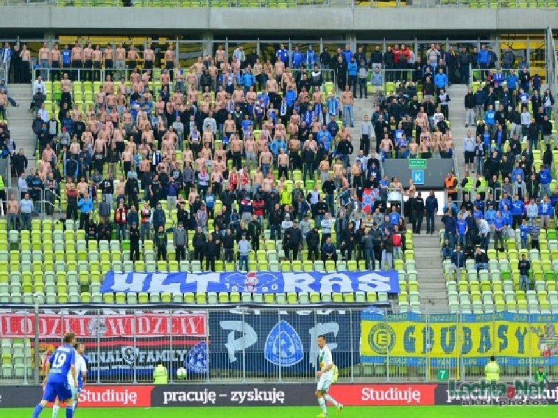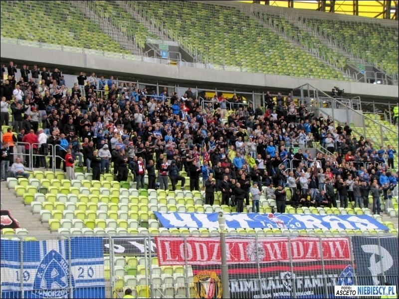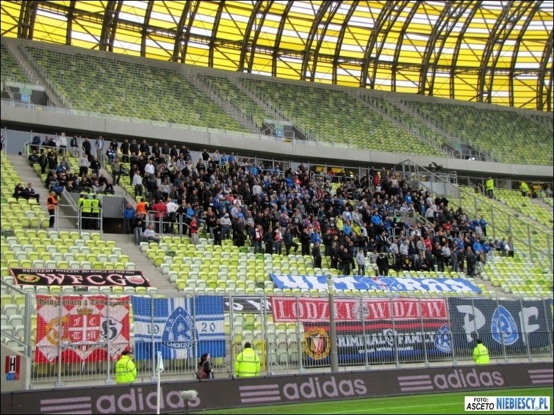 epozytu, który na nowym stadionie powinien być standardem. Również przeszukania były chwilami zabawne. Śledzący pies tropiący albo ściąganie w wybranych przypadkach tylko lewego buta do kontroli ;) W międzyczasie pod stadion dotarła grupa Elanowców, która dojechała autokarem i samochodami oraz 35 Widzewiaków z Grudziądza, którzy również wybrali transport kołowy. W Gdańsku pojawiliśmy się łącznie w 540 głów, z czego na sektorze gości zasiadło 525 osób. Razem z nami około 150 fanów Widzewa i 62 toruńskich fanatyków. Kilku zakazowiczów zostało pod stadionem, a kilku już na dworcu odłączyło się i wyruszyło na zwiedzanie Trójmiasta. Sektor gości przyozdobiło 9 flag. Cztery Ruchu: "P/R\F", "19/R\20", "ULTRAS", "To My Naród Śląski"; trzy Widzewa: "Łódzki Widzew", "WFCG" i debiutująca "FC Tomaszów Mazowiecki", która miała zawisnąć już ostatnio w Krakowie; jedna Elany: "Grubasy", a także łączona Ruchu i Widzewa "Criminal Family". Ochrona chciała ściągnąć wywieszoną "Konfederatkę", tłumacząc, że to symbol zakazany, ale nie potrafiła tego niczym umotywować.