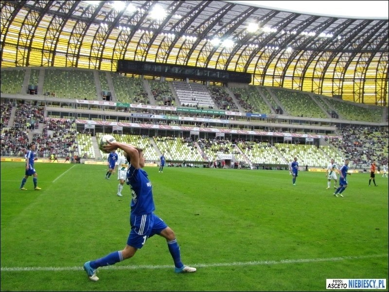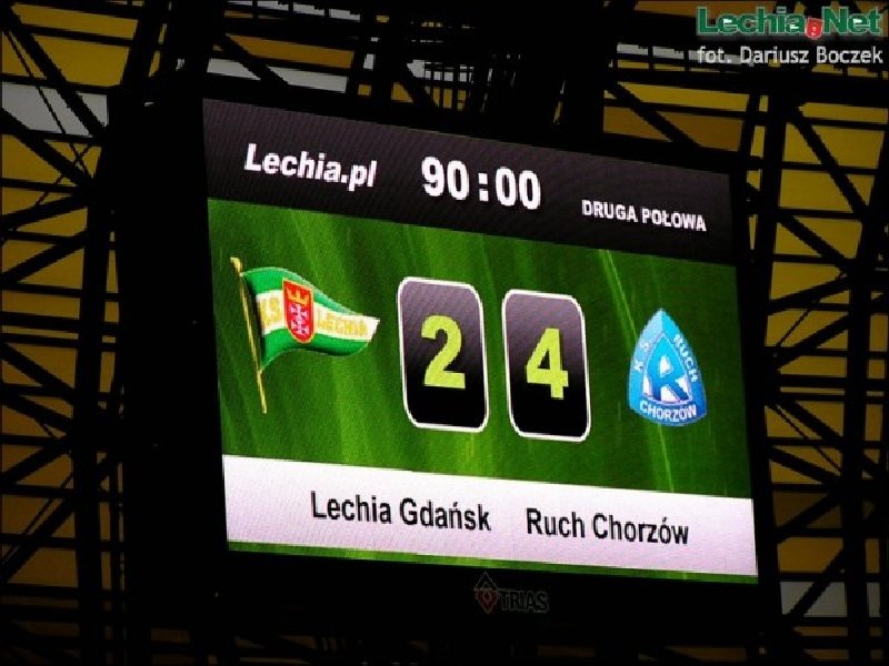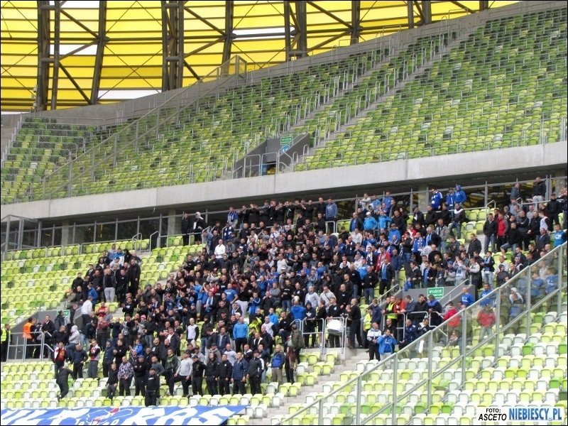 Flaga wisiała do końca spotkania... Doping można ocenić jako średni, ale momentami "Niebiescy" dawali całkiem dobre popisy wokalne, w szczególności po bramkach. Po drugim trafieniu część kontynuowała doping bez koszulek. W dopingu nie zabrakło pozdrowień dla naszych przyjaciół z Widzewa oraz Elany. Również Lechii nie szczędzono uprzejmości. Niestety, piłkarze pokazali jak w przeciągu chwili można zaprzepaścić wszystko i prowadząc 4:2 do 90 minuty pozwolili rywalowi wyrównać. Udowodnili, że można przegrać wygrany mecz, zdobywając tylko jeden punkt. Za postawę w końcówce spotkania zawodnicy Ruchu musieli usłyszeć kilka gorzkich słów od kibiców, które przyszło im wysłuchać jedynie ze spuszczonymi głowami. Jedynie kilku (Łukasz Janoszka, Marcin Malinowski) odważyło się podejść bliżej, by rzucić koszulki meczowe. Po meczu ponad dwie godziny oczekiwania na stadionie, aby wyruszyć w kierunku dworca. Porównując z naszą ostatnią wizytą, tym razem zdecydowanie mniej czasu spędziliśmy na Baltic Arenie. Niestety, catering również podupadł i już normą na nowych stadionach staje się nijaka kiełbasa w bułce i hot dog, a na pocieszenie festynowe piwo za 10 złotych. Ze stadionu wcześniej wypuszczono zmotoryzowaną grupę Elanowców i fanów Widzewa z WFCG .