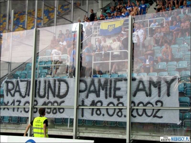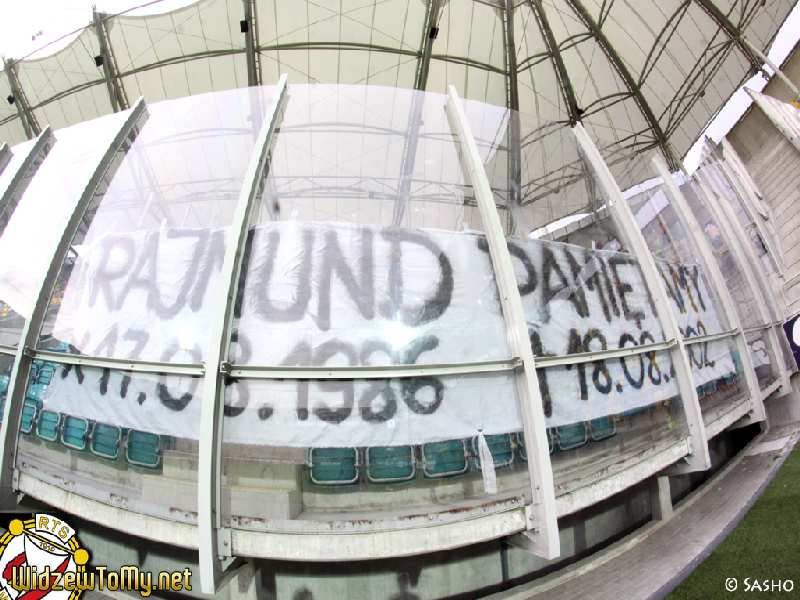 W sektorze gości zawisła tylko jedna flaga "PSYCHO FANS" oraz transparent "RAJMUND PAMIETAMY * 17.08.1986 + 18.08.2002", ku czci naszego brata po szalu.