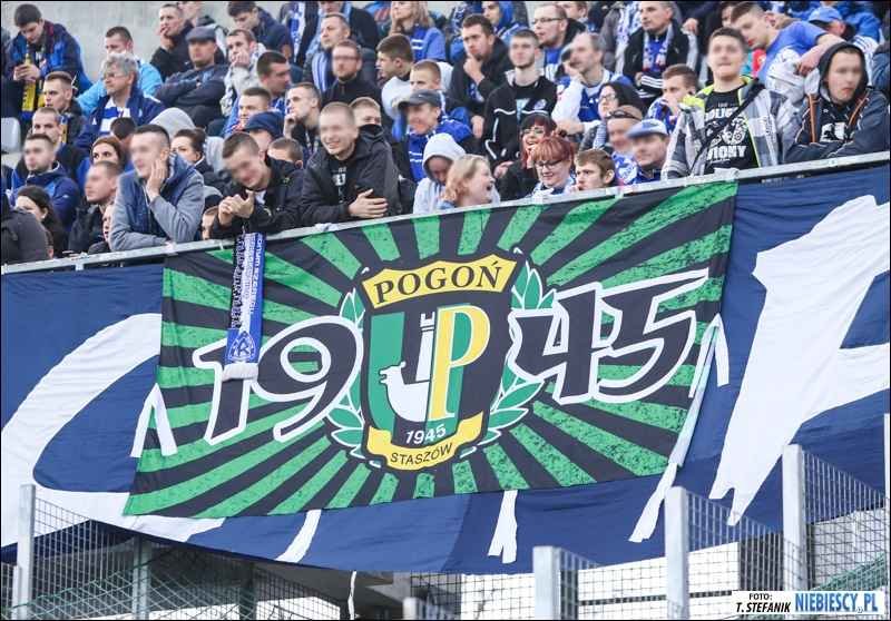 "Radlin", "Zawiercie", "Niebieskie Siemce - ekipa wyjazdowa", "N/R\K" (wyjazdówka Katowic), "Racibórz", "Niebieskie Łaziska", "Świętochłowice", "Kęty", "Śląsk Cieszyński" oraz dwie flagi Pogoni Staszów "19P45" i "Tylko Pogoń". Dodatkowo w drugiej połowie Niebiescy ze Staszowa wywiesili transparenty "Denis 3maj się" i "W Staszowie bez zmiany K.S. Ruch pany!".