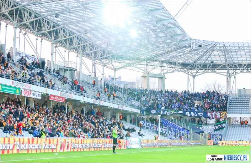Fani Korony praktycznie jak zawsze zapełnili środkową część górnej trybuny młyna i dobrze oflagowali swoje sektory. Ciężko określić ich doping, bo stosunkowo rzadko przebijał się na sektorze gości. "Koroniarze" próbowali w pierwszej połowie jakichś podchodów pod sektorem gości. Pytanie jedynie czy tak nieudolnie próbowali przeprowadzić szarżę na flagi, chowając się za filarami licząc, że mają pelerynki niewidki i nikt ich nie widzi, czy po prostu chcieli zobaczyć "jak to się robi na południu". Tym niemniej śmiesznie to wyglądało z boku - "pójdę, nie pójdę, pójdę, nie pójdę" i nie poszli ;)