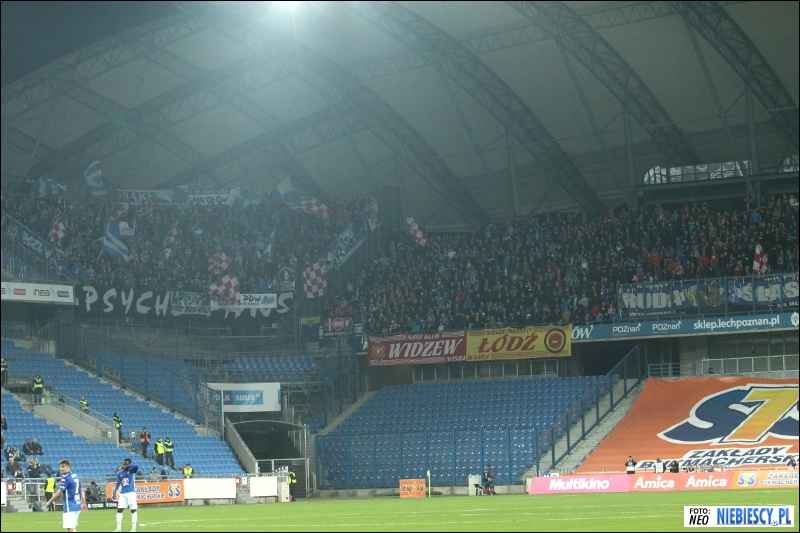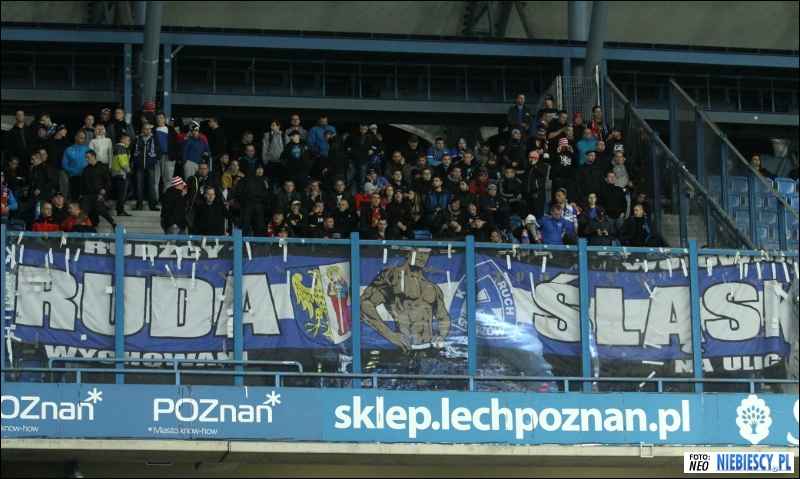 Pomimo wyjazdu z Chorzowa o godz. 8:40, Niebiescy pod stadion dotarli dopiero na godzinę przed meczem, jednak samo wchodzenie przebiegało dosyć sprawnie i większość przybyłych obecna była na sektorze przed pierwszym gwizdkiem. Klatkę przyozdobiło kilkanaście flag Niebieskich w tym m.in.: "Psycho Fans", "Widzew Łódź", "19/R\20", "Niebieskie Siemce", "N/R\K", "Ruda Śląska", "Niebieskie Łaziska", "Radlin", "Nakło Śląskie", "Mikołów", "Kęty", "Racibórz" oraz transparenty "Zając PDW", "Herman wracaj do zdrowia", "Api PDW” oraz transparent Widzewa "Śmierć konfidentom". Trzeba zaznaczyć, że w repertuarze fanów Ruchu oraz Lecha nie zabrakło licznych bluzgów.