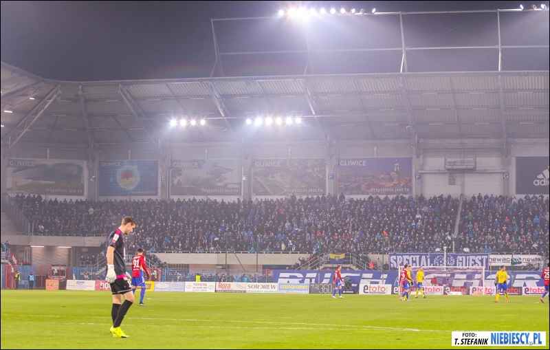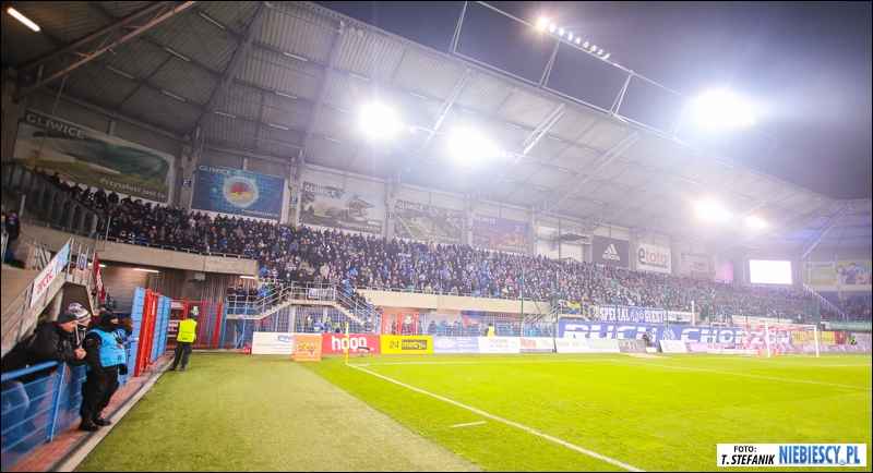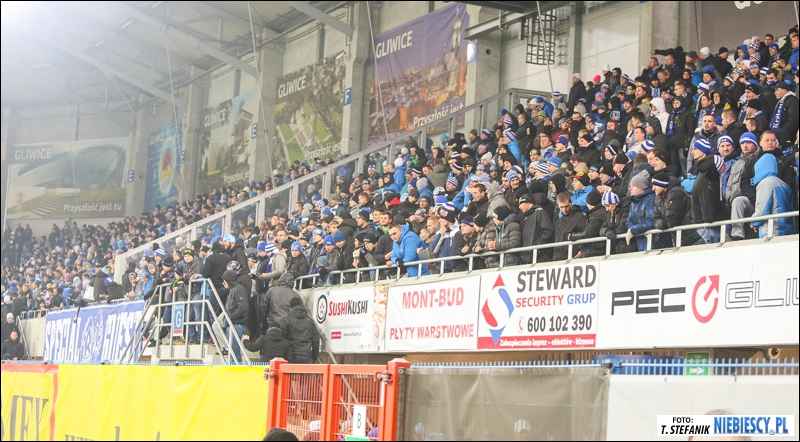 Zbiórka kibiców zaplanowana została o godz. 17:30 na parkingu klubowym i po 18:00 większość osób wyruszyła w kierunku Gliwic. Oczywiście sporo osób dojeżdżało później, ale już mniej więcej dwie godziny przed meczem pierwsi kibice Ruchu zaczęli kręcić się w okolicach stadionu i z minuty na minutę Niebieskich przybywało. Na godzinę przed pierwszym gwizdkiem na stadionie było już kilkuset kibiców Ruchu i frekwencja cały czas wzrastała. Pomimo wykupionych biletów na łuk oraz część prostej, Niebiescy ostatecznie zajęli i zapełnili ponad stan całą trybunę za bramką wraz z narożnikami. Dodatkowo grupa chorzowian obecna była na prostej.