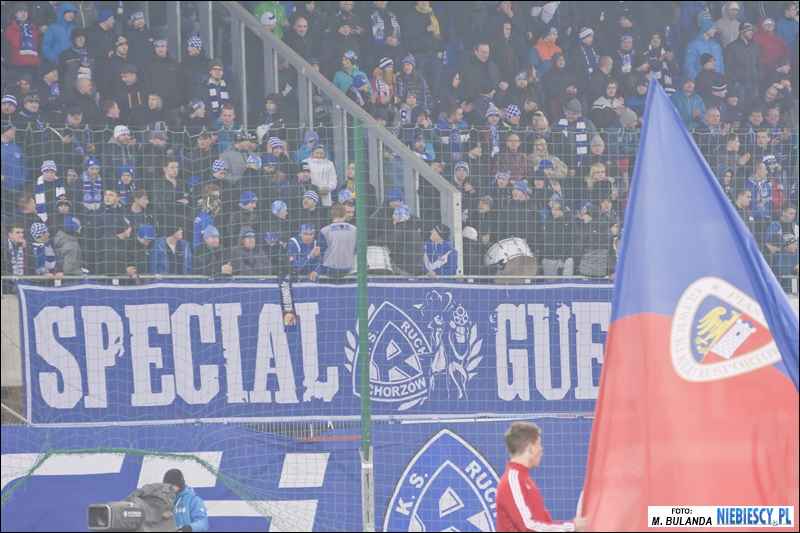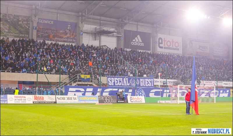 Oficjalna liczba "Niebieskiej Szarańczy" na meczu w Gliwicach to 3300 osób, chociaż można byłoby polemizować czy czasem nie było nas więcej. Ponad trzy tysiące osób na zakazie wyjazdowym robi wrażenie. Podczas meczu wsparła nas również grupa około 100 Widzewiaków oraz delegacja Elany Toruń, którym dziękujemy za wsparcie. Nie możemy również pominąć "Super MaRia" czyli Mariusza Śrutwy, który wraz z kibicami dopingował Niebieskich z trybun. Mamy nadzieję, że kolejne wyjazdy będą równie sumiennie zaliczane przez "MaRia" ;) Sektory zajęte przez fanów Ruchu przyozdobiły dwie flagi "Special Guest" oraz "Ruch Chorzów".