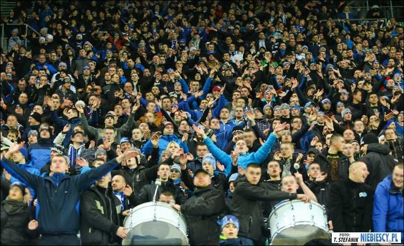 Chwila przed wyjściem piłkarzy na boisko została wykorzystana do przećwiczenia nowej przyśpiewki. Młyn Śląska skandował natomiast "piłka nożna dla kibiców", co można było usłyszeć również z sektorów zajmowanych przez fanatyków Niebieskich. Gospodarze dodatkowo zostali nagrodzeni brawami za możliwość obejrzenia meczu przez kibiców z Chorzowa, którzy również głośno zaskandowali "jesteśmy zawsze tam...".